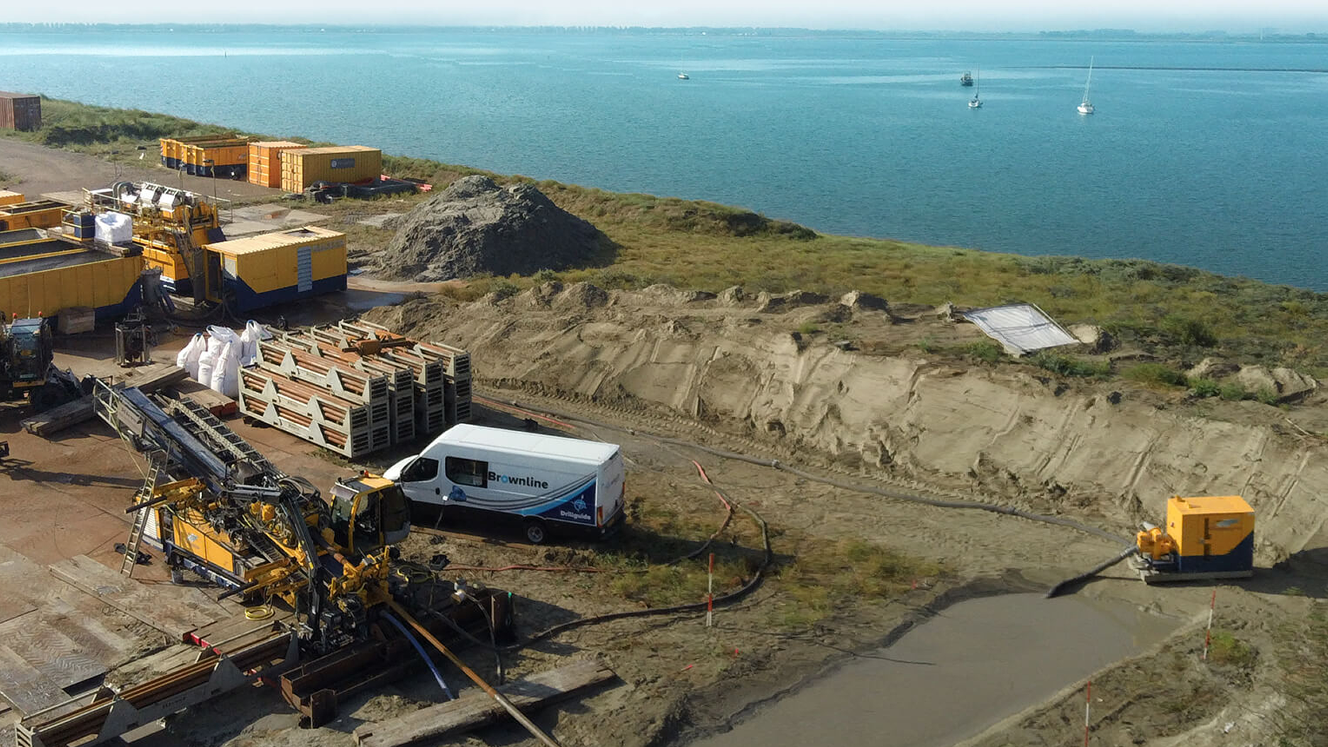 Um problemlose Einsatz während des Lebenszyklus des Windparks zu gewährleisten, wird auch das Stromverteilungsnetz erneuert. Brownline hat 4 parallele Bohrarbeiten mit einer Länge von jeweils 727,50 Metern vermessen. Die Trajektorie wurde in einem Korridor mit einer Breite von weniger als 20 Metern und einer Tiefe von 12 Metern festgelegt. Der Korridor kreuzt sich unter der viel befahrene Autobahn N57, die die Inseln Zeelands miteinander verbindet, und verläuft direkt neben dem Besucherzentrum Neeltje Jans, sodass die Belästigung in diesem hektischen Gebiet auf ein absolutes Minimum limitiert werden mussten. Auf der anderen Seite verursachten der N57 sowie die bereits vorhandenen Bauvorbereitungen erhebliche Störungen.