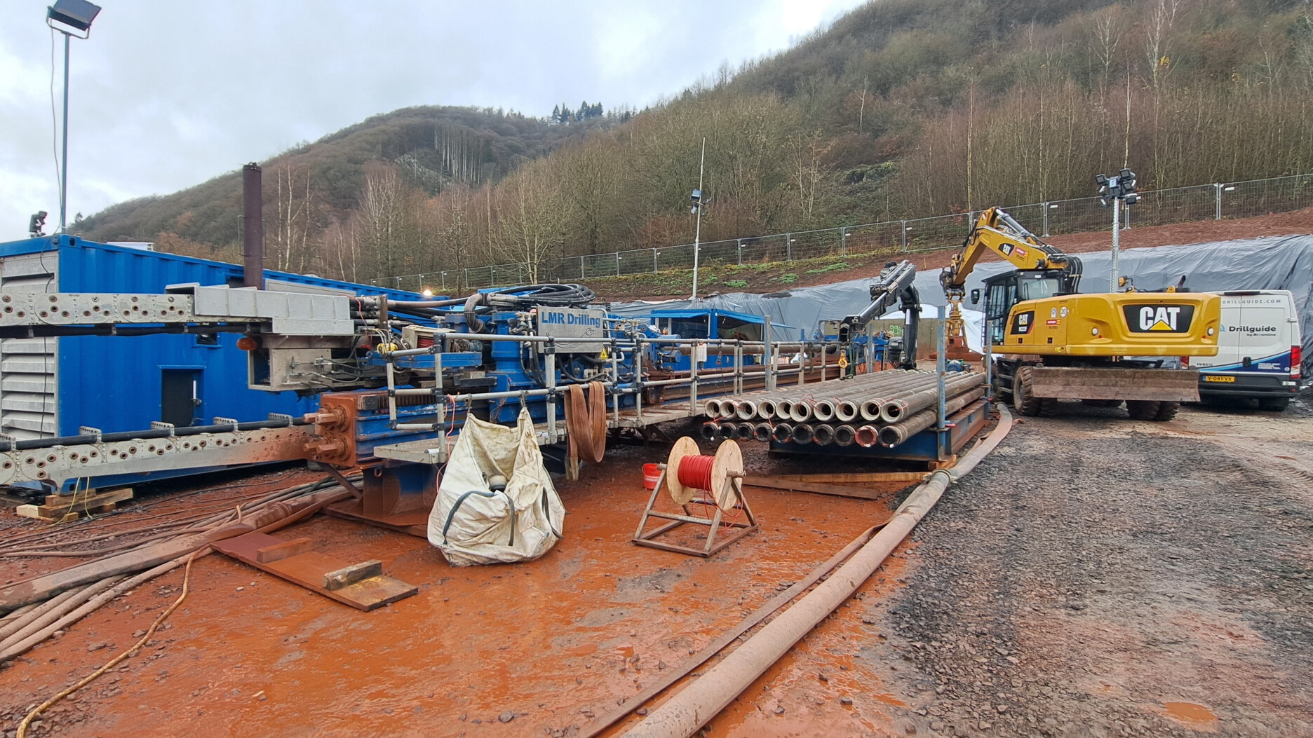 Bij de meeste projecten boren we eerst omlaag, de grond in. Bij dit project stond de boormachine juist vlak opgesteld en werd de boring bergopwaarts gestuurd. In het besneeuwde Moezeldal voerde onze klant LMR Drilling en bijna 1000 meter lange HDD-boring uit. Het intredepunt bevond zich in de vallei bij Sankt Aldegund en de boring kwam 280 meter hoger op de helling weer boven.