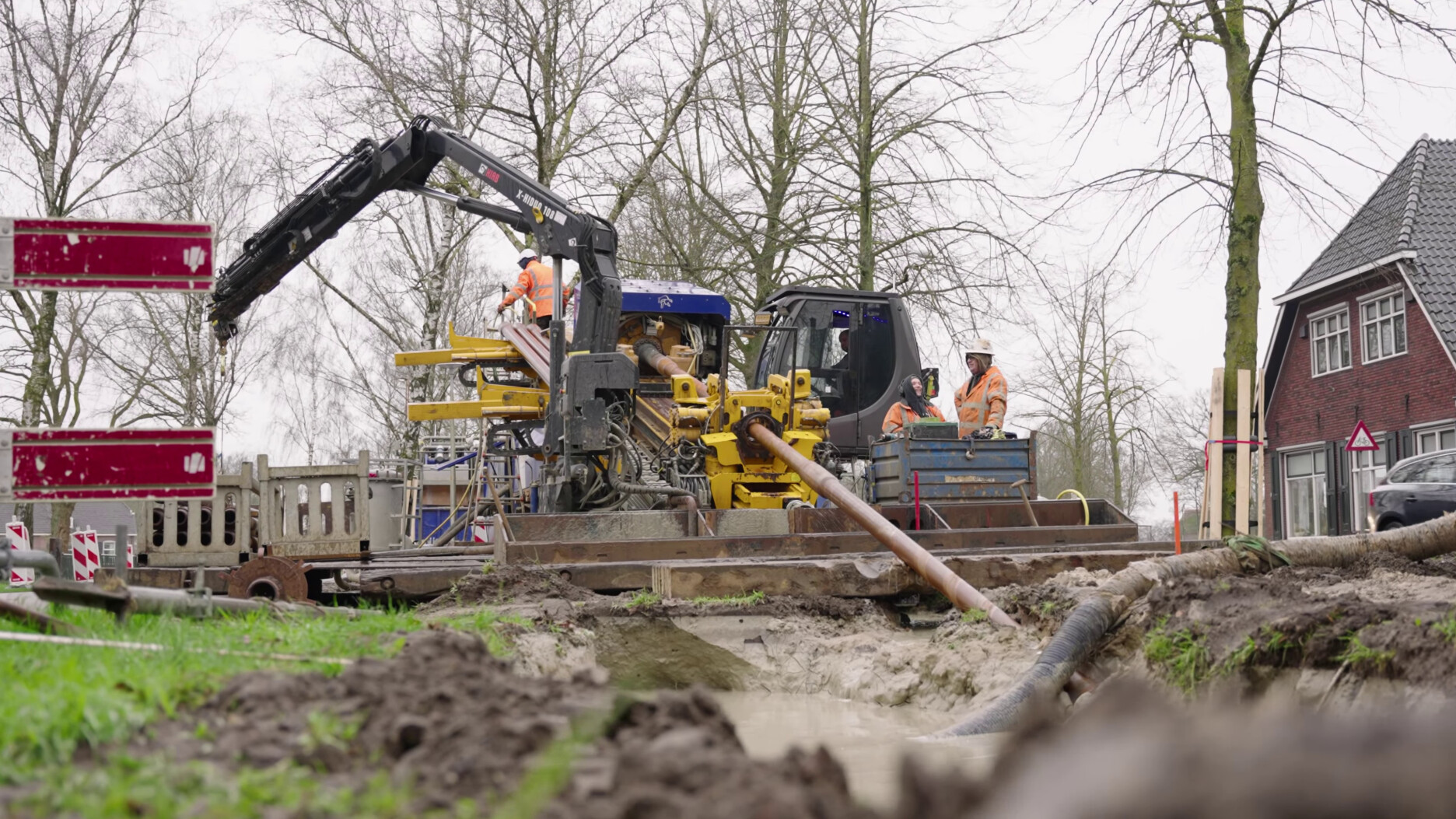 Nabij de kruising in het hart van het dorp werd op zo’n 20 meter diepte de intersect gemaakt. Om deze zo soepel mogelijk te laten verlopen werd Brownline’s Radar ingezet. Met onze Radar tool kan de afstand tussen de beide boorkoppen zeer precies gemeten worden. Zo kan een optimale lijn geboord worden met behoud van radius om de boorgaten soepel aan elkaar te verbinden. Een vloeiende intersect zorgt ervoor dat er lagere trekkrachten nodig zijn om de bundel kabelmantelbuizen in te trekken.