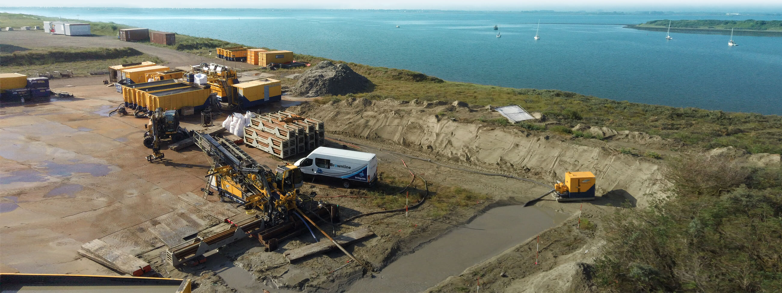 De Oosterscheldekering; een prachtig staaltje Hollands watermanagement. Naast de waterkering en attractiepark Neeltje Jans, zijn hier ook verschillende windmolenparken te vinden die bijdragen aan de opwekking van duurzame energie. Na een voorbereiding van 10 jaar is dit voorjaar begonnen met een optimalisatie van de windmolenparken, waarvoor Brownline in augustus 2020 vier boringen heeft ingemeten.