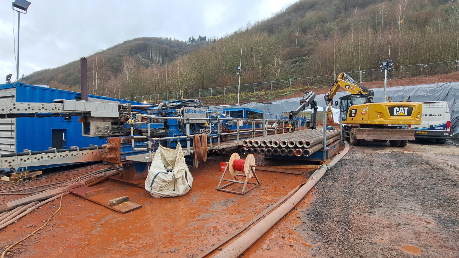 With most projects we first drill down into the ground. But with this project, the rig was positioned flat and the drill was directed up the hill. In the snowy Moselle Valley, our client LMR Drilling carried out the HDD crossing with a length of nearly 1000 m / over 3000 ft. The entry point was down in the valley near Sankt Aldegund and the drill punched out 280 m / 919 ft higher on the slope.